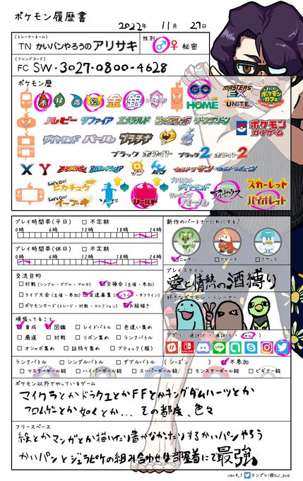 かいパンやろう、パルデア入国にあたり、なんか履歴書を書く。 特段泳ぎは得意ではなく、それほど水ポケモンも使わない。もっぱら、いつも陸にいる。 かいパンやろうを名乗る理由は一つ。 かいパンは部屋着としても履き心地がいいのだ。 #ポケモン履歴書 #ポケモン絵描きさんと繋がりたい #ポケモンSV
