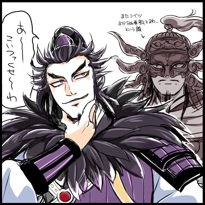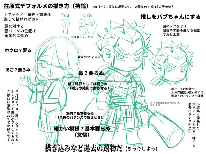 3 49 01.デフォルメ時に気をつけていること ①簡略化 ②誇張 ですかね…(できているかどうかはさておき) 最低限キャラ本人と分かる要素と雰囲気だけ残して残りは単純化しています。ラフと合わせて描いてみました。 蒙恬と蒙武。 20/05/12 01:13