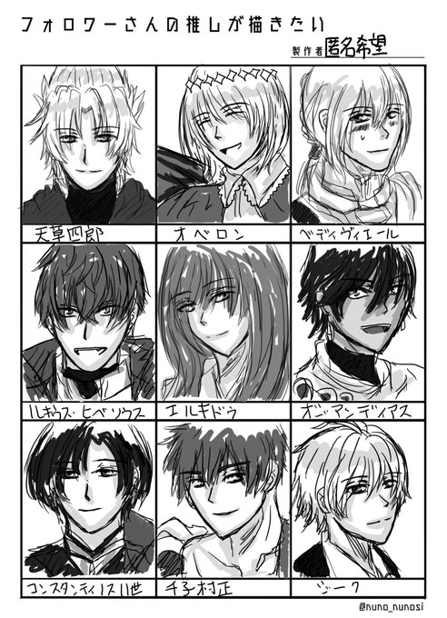 #フォロワーさんの推しが描きたい ・天草四郎 ・オベロン ・ベディヴィエール ・ルキウス・ヒベリウス ・エルキドゥ ・オジマンディアス ・コンスタンティノス11世 ・千子村正 ・ジーク でした! twitter.com/Arrrrthurrrr…