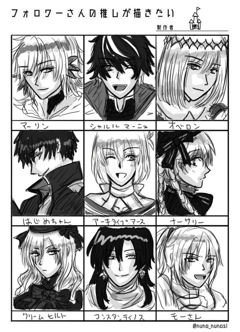 #フォロワーさんの推しが描きたい ・マーリン ・シャルルマーニュ ・オベロン ・斎藤一 ・アーキタイプ・アース ・ナーサリー・ライム ・クリームヒルト ・コンスタンティノス11世 ・モードレッド でした( ˘ω˘ )