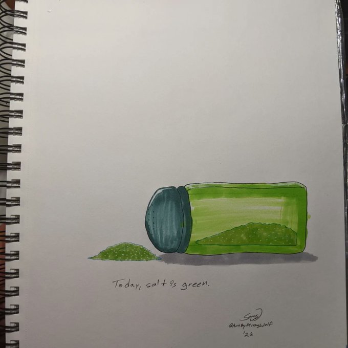 #inktober day 17: salt Today, my green car unexpectedly burst into flames on the highway, and is a total loss. I'm a little salty about that. Hence, salt is green today. #saltshaker #spilledsalt