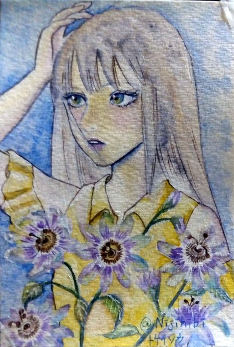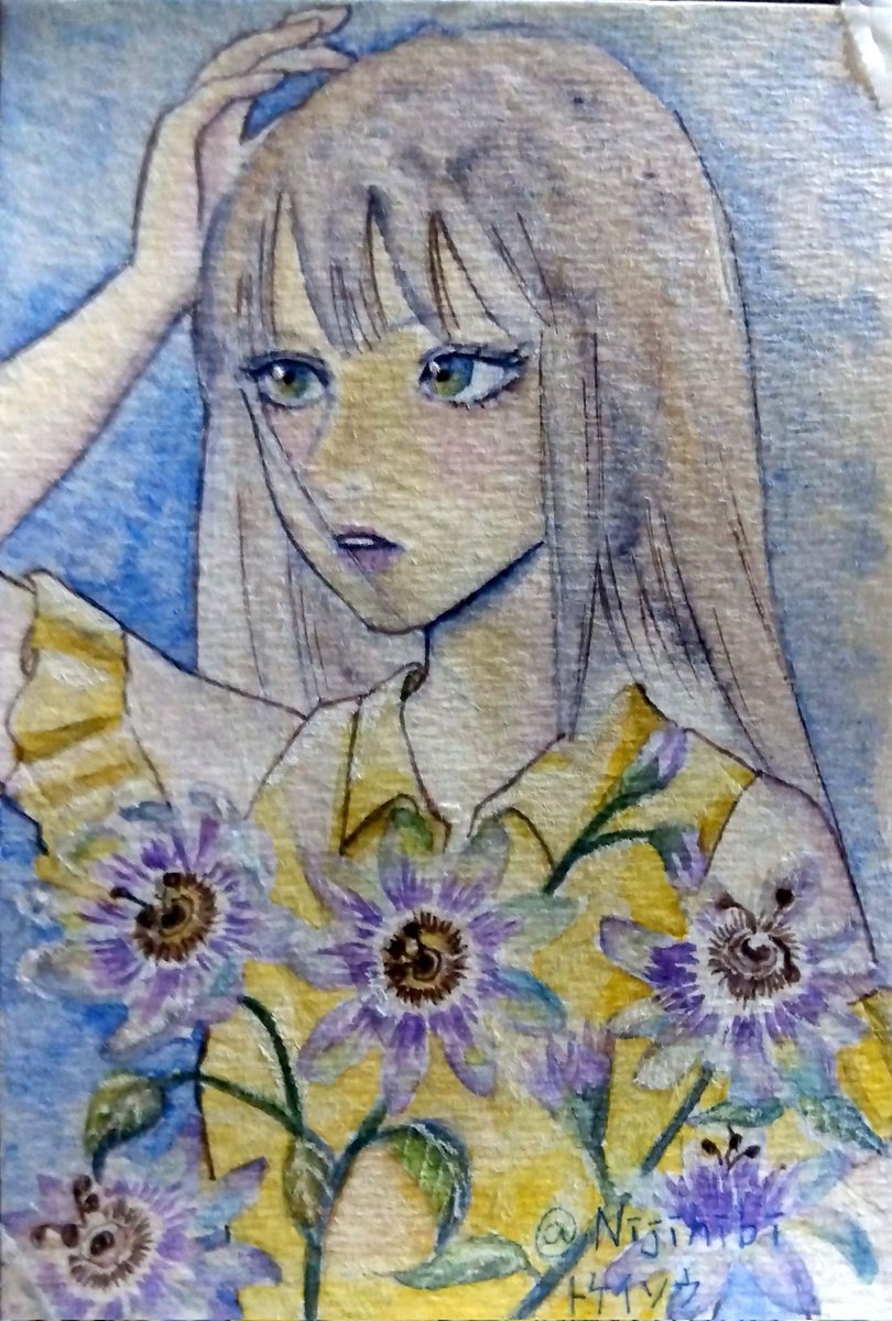 『7月 トケイソウ』 白をカッター削って表現しようとして見事!…失敗しました😂トホホ でも髪は初めて自分の思い通りの塗り方になってホッでした=3 #絵描きさんと繫がりたい #水彩画 #アナログ絵