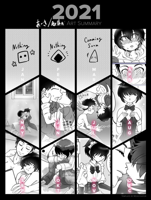 今年一年の振り返り😊今年描いた漫画一覧♪ 4月にリトナイに嵌って以降、いっぱい漫画を描いて、色んな素敵な方ともお知り合いになれて、本当に幸せでした💕 まだまだ描きたいお話は沢山あるので、来年も引き続きお付き合いよろしくお願いします! #ArtSummary2021 テンプレート@ mossygator_様