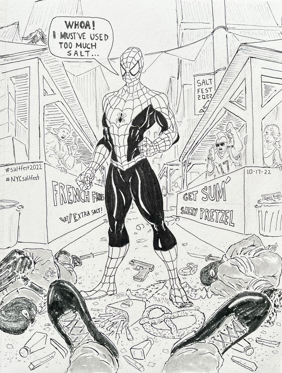 Salty Day 17 of Inktober It was a sunny day at Salt Fest. When all of a sudden, three radical anti-salt activists appeared, then began to terrorize everyone. Until Spider-man showed up and apprehended them. #inktober2022 #inktober #art #SpiderMan #draw #salty #Artists #artwork
