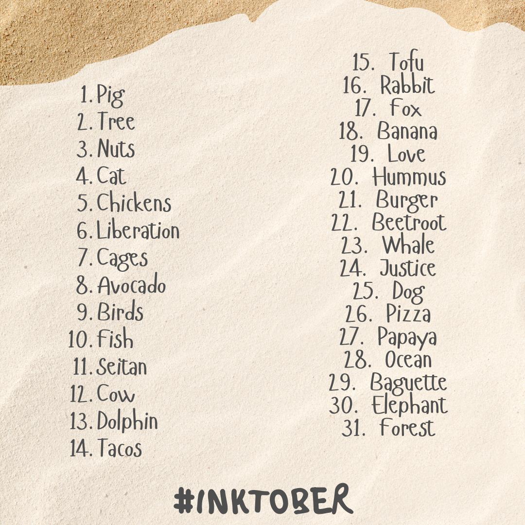 Nos sumamos al #inktober2020 con la lista de temática sobre veganismo que hizo @instintovegano Actualizaremos cada 8 días la participación de @veganmpire y el resto de artistas que se quieran sumar, cada 4 días (pues en un tweet solo caben 4 fotos) Reto a @Eri_Rich Abrimos hilo: