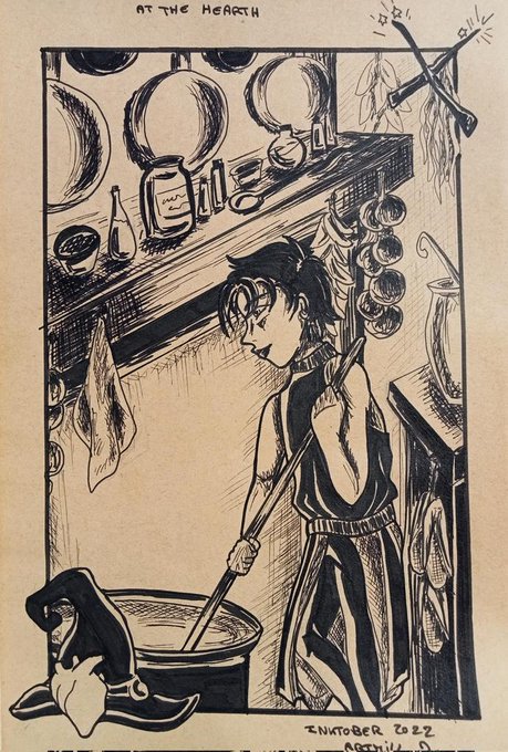At the Hearth - Inktober 2022 #inktober2022 #Inktober #witch #cauldron #myOC #storiesImightwriteoneday #artwork #potions #witchtober #inkpen #traditionalartist #traditionalart