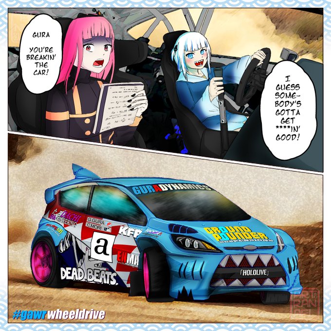 「SHARK & DEATH GOES RALLYING」 "You won't believe it, there was a shark rally car!" - Rana ft. @gawrgura x @moricalliope #dirtrally #rally #art #illust #gawrt #callillust #カリイラスト