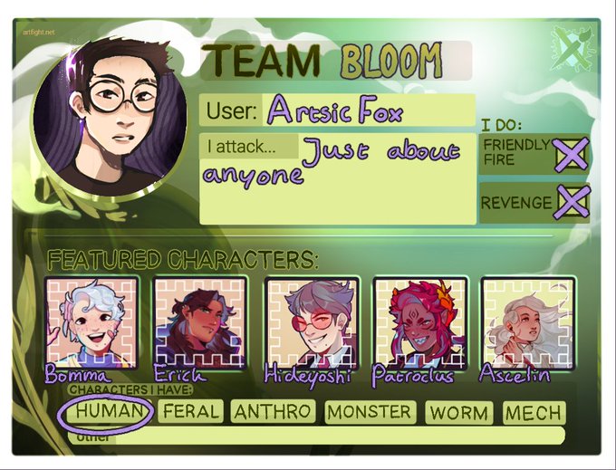 First time I've used the artfight template 😅 But I'm looking forward to this year! My account is : artfight.net/~ArtsicFox Feel free to drop a link to your account ♡♡♡ #Artfight2022