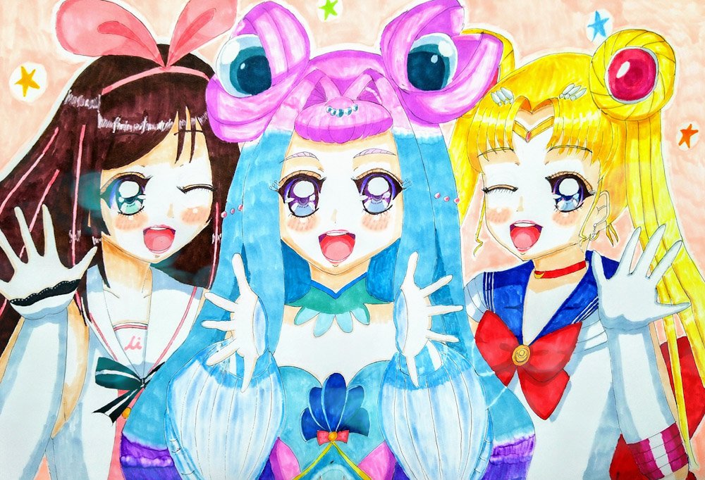 セーラームーン🌙 キズナアイ🎀 キュアラメール🧜 の合同バースデー絵です! みんな今年もおめでとー🎉 #MisterJArtworks #月野うさぎ生誕祭2023 #キズナアイが生まれた日2023 #キズナアイ生誕祭2023 #キュアラメール生誕祭2023