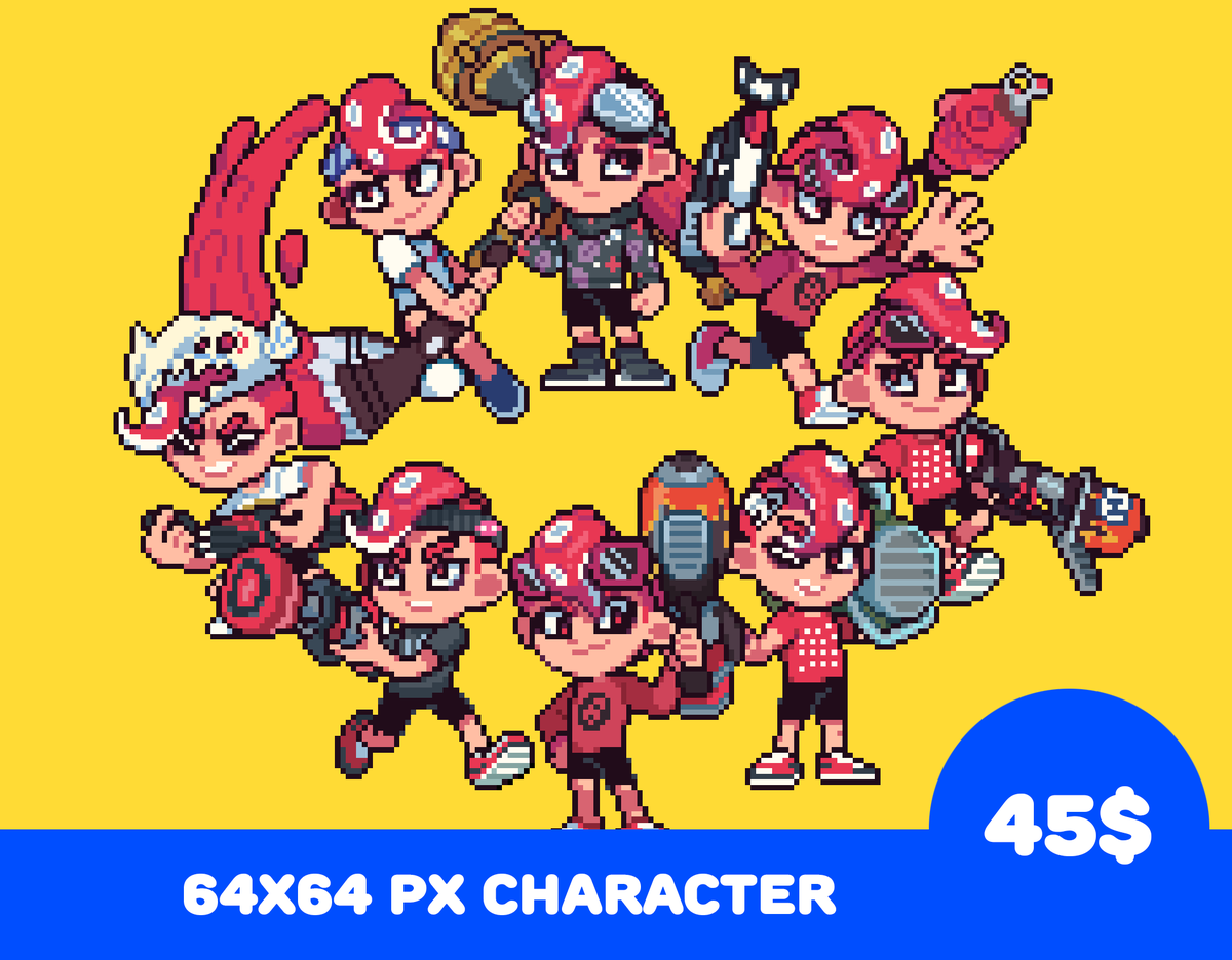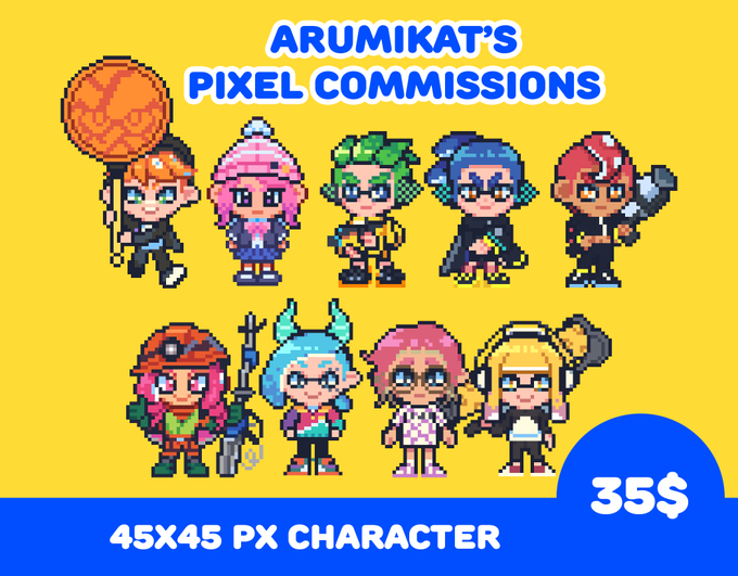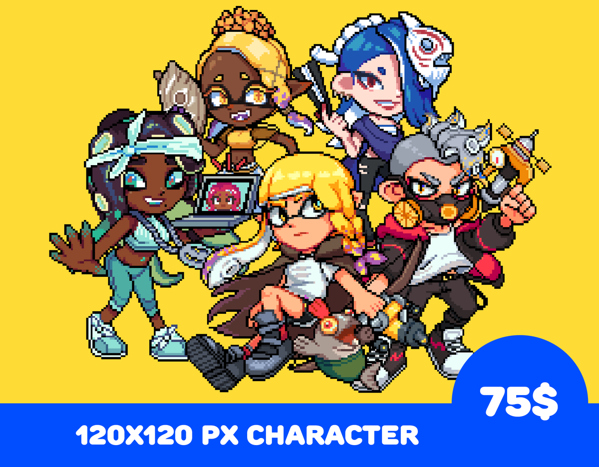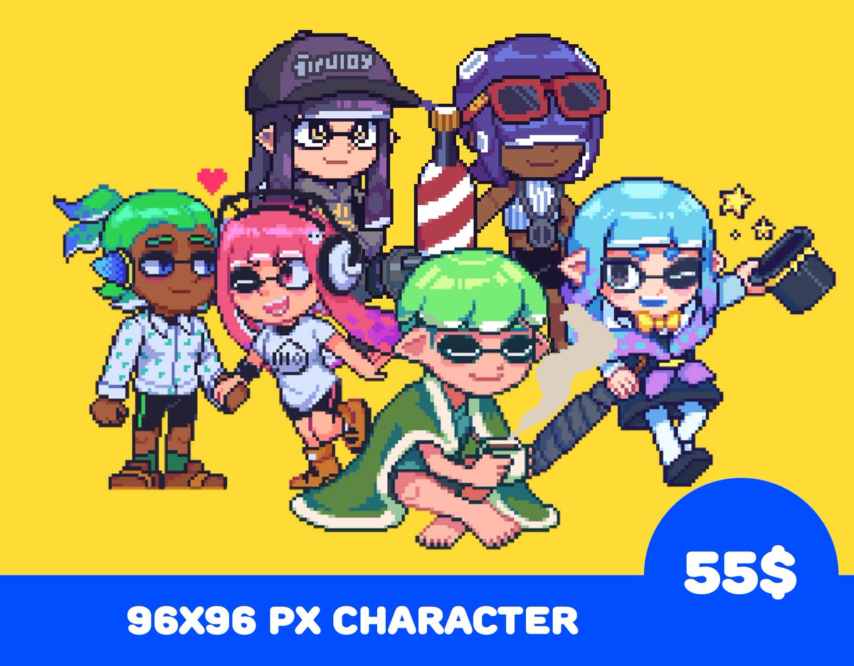 (RTs appreciated!) Hi guyssss <3 I'm opening my static #pixelart commissions! Please DM me with the commission details if interested! Weapons and other accessories can cost extra. #commissionsopen #splatoon