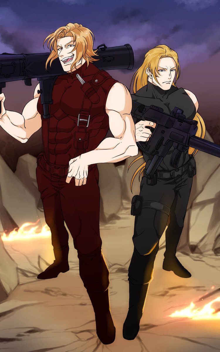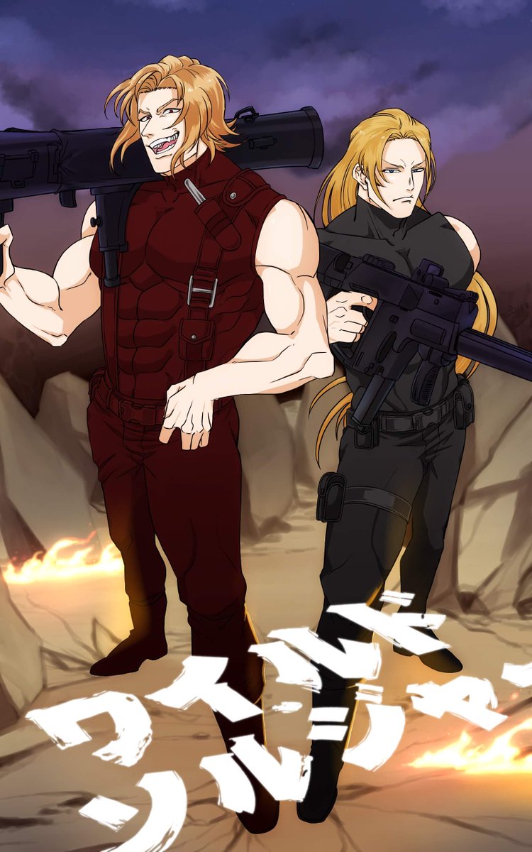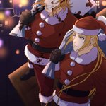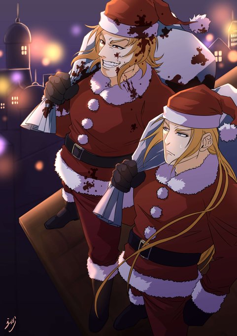 #クリスマス2022小説・イラスト祭り #推し絵師様のイラストを紹介させて頂く ハンニバル「サンタがなぜ赤いのか知っているか? 血なんだよ。サンタに逆らった奴らのな!」 マティアス「お前、プレゼントを配る前に悪党を蹴散らすなとあれほど言ったじゃないか……」 絵:漆原 白様