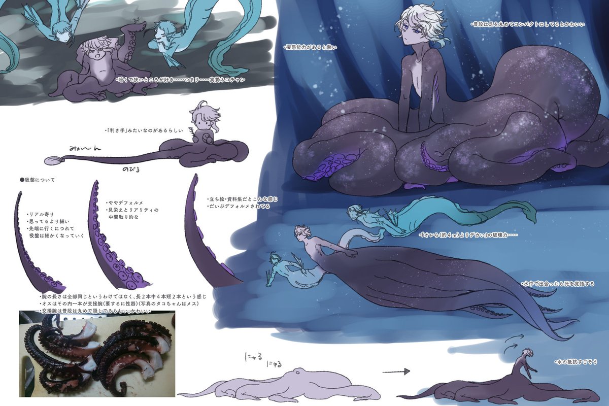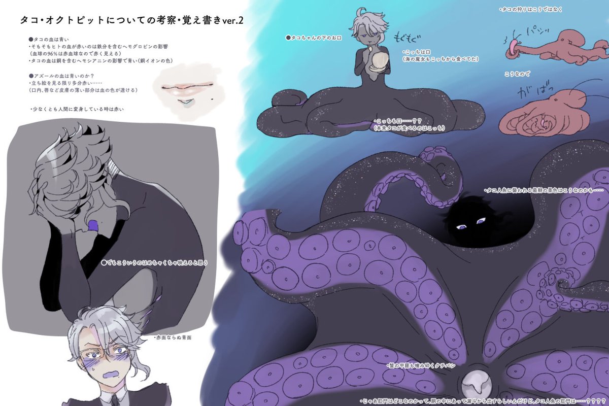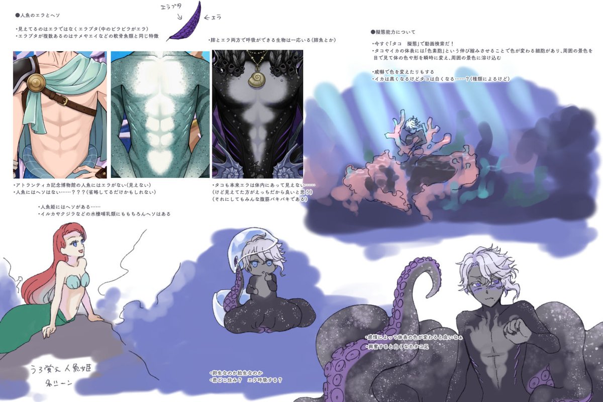 🐙の人魚フォームについて、元ネタにも若干触れつつ色々考えてみたその2。タコちゃんの下のお口はどうなってるのかな……!!(not下ネタ) 珊瑚の海ご当地イベントいつまでも待っています。そしてあわよくば人魚カード実装を……! #twstファンアート