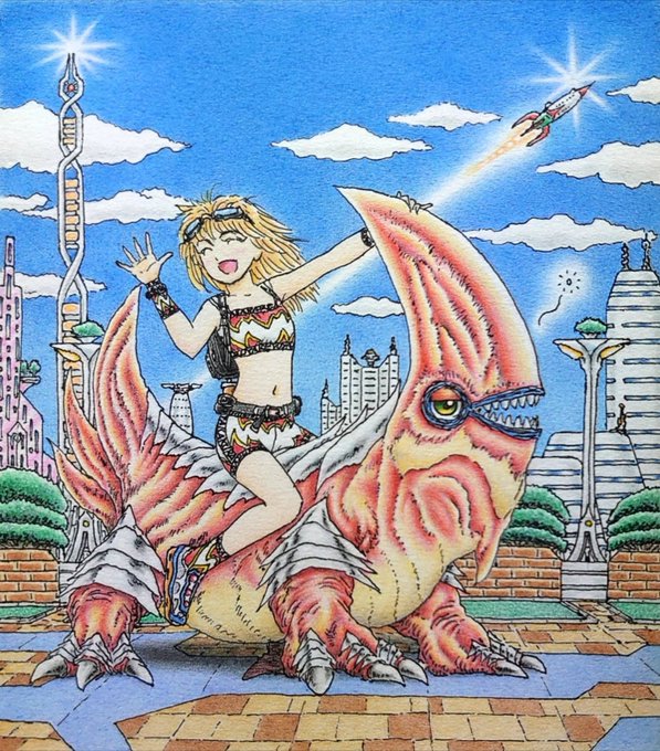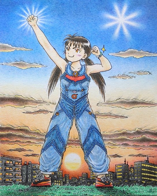 🔰サロペット少女。帰ってきたウルトラマン風。 #帰ってきたウルトラマン #ウルトラマンジャック #ウルトラの星 #色鉛筆イラスト #イラスト #イラストレーション #女の子イラスト #夕焼け #夕陽 #ビルガモ