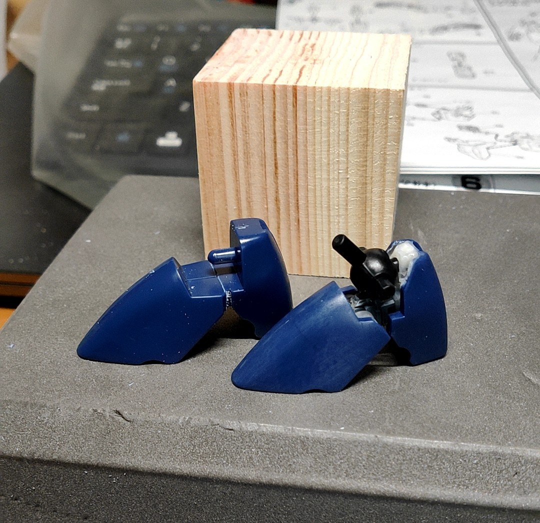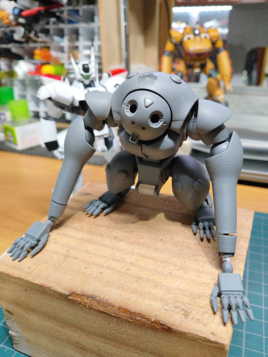 仕事に時間食われて中々進まないファントム進捗。 腕と脚の黒いところはイラスト見るとスリット入ってるので彫り込みました、肩アーマーは腕接続から肩軸に噛ませる方式にしつつ位置を少し上げてます。 #パトレイバー模型部
