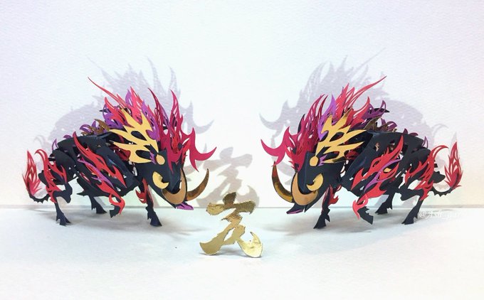 改めまして、あけましておめでとうございます🎍 亥年なので紙なイノシシ2匹です。「亥」の字の形を取り入れてる部分があるけどわかるかな……?ちなみに金色の紙は正月飾りに台紙として入ってるアレです。