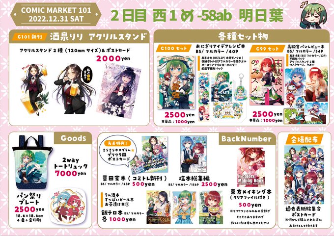 コミックマーケット100、サークル明日葉のお品書きです🌱 新刊は100回記念!という事でみんなで作った読者参加型のおにぎり本になります!!おにぎりでお祝いだー🍙❣ #C100お品書き #C100新刊 #C100 #C100飲食同人誌新刊まとめ 🍈メロンブックス様で委託もしています!melonbooks.co.jp/detail/detail.…