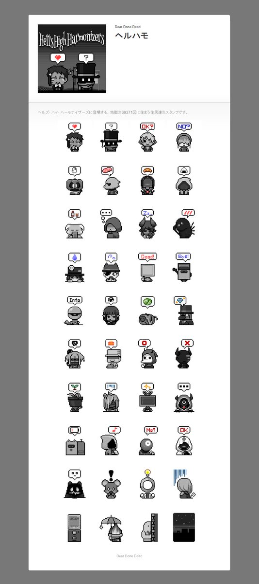 お待たせしました。以前よりご要望を頂いてましたヘルハモLINEスタンプ、リリースしました! よろしければお使いくださいー。 store.line.me/stickershop/pr… #HellsHighHarmonizers #ヘルズハイハーモナイザーズ #ヘルハモ #indiegame #人外 #ドット絵