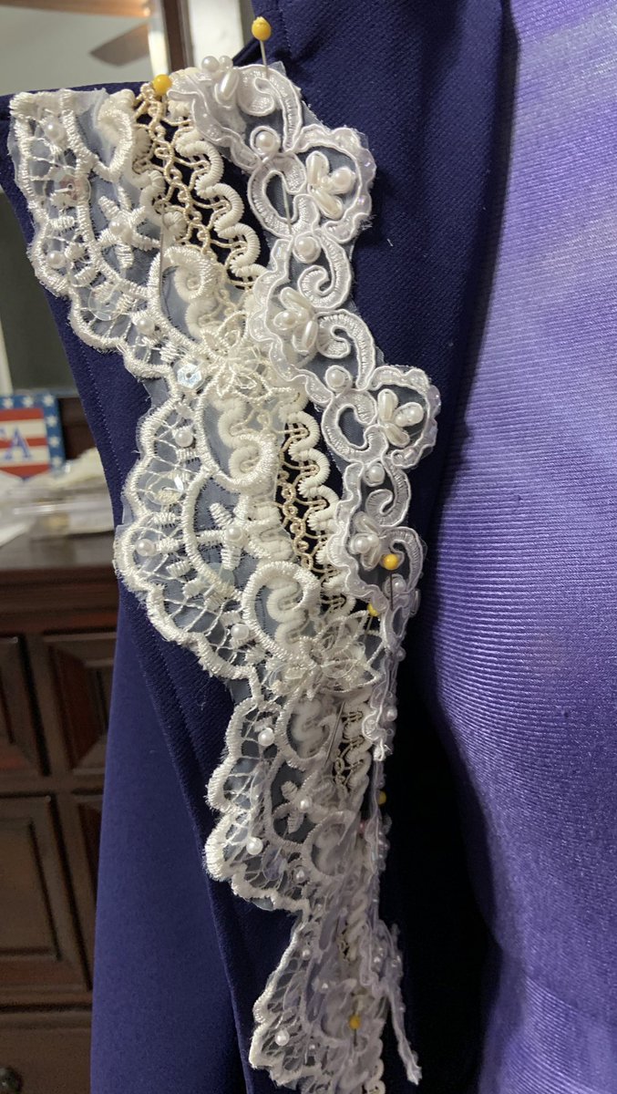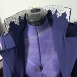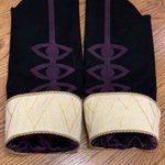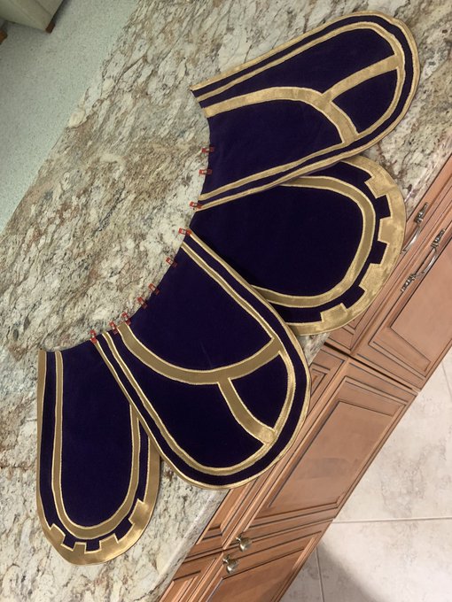 Apron is done! I’ll attach it together with a snap. I realllly love how lush the gold and purple satin linings are for the cuffs and sleeves… hehe :3 Also the trim is leftover from Cardverse ayooo #fireemblemcosplay #wip #robin