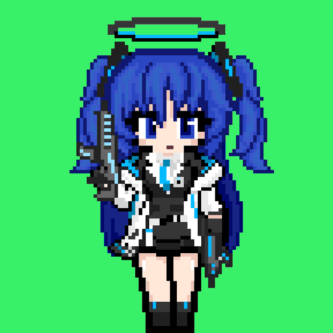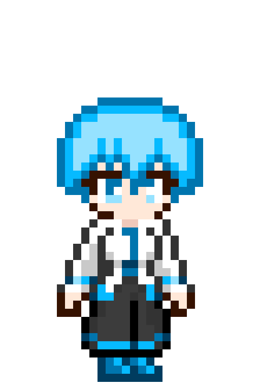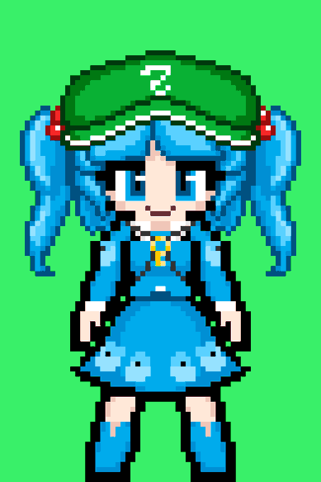 ほいっと 東方風神録より 河城にとり 完成ですの そこそいい感じに出来たんじゃねぇかなぁ... というか何で黒塗りで分かるんや 色見分けるテストちゃうんやぞ... #ドット絵 #東方Project #河城にとり