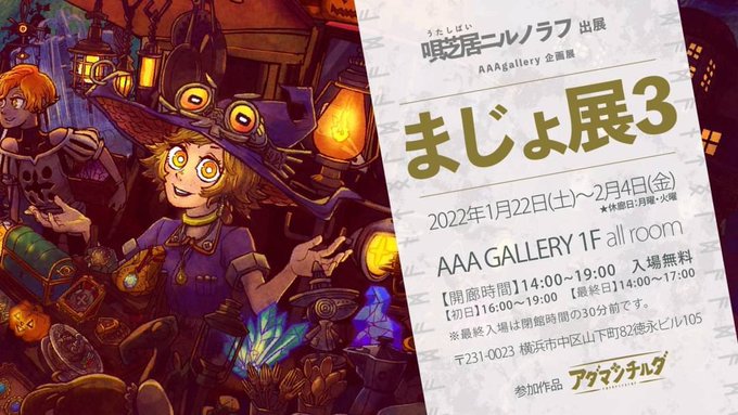 【今週金曜まで 】 『#アダマンチルダ』が横浜の #AAAGallery にてグループ展 #まじょ展3 に出展しています! 《 開 催 期 間 》 2022年 1/22(土)~2/4(金) 14:00~19:00(最終日は17時まで) ※月・火は休館日 お待ちしております!! #展示会 #イラスト好きな人と繋がりたい