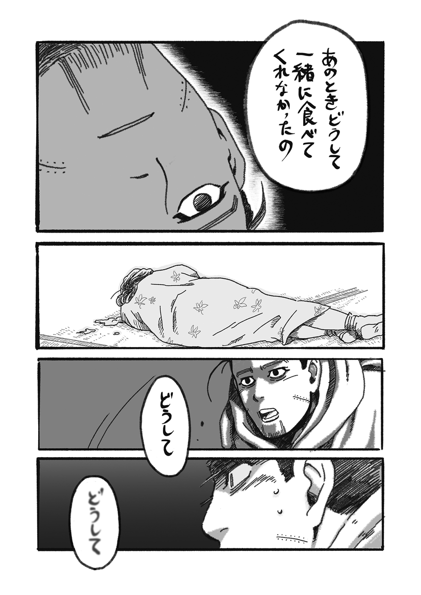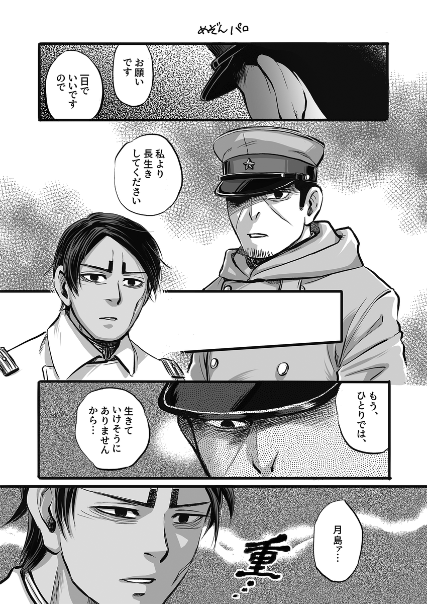 #ゴールデンカムイ版深夜の真剣お絵描き60分一本勝負 お題:第七師団 遅刻&深夜投稿ほんとすみません…!! 谷垣の賢吉語りの回が好きで、その時のイメージです。 回想シーンの影トーンの線数が粗めなのと、作中屈指の冴えざえとしたペンタッチがとても良かった…
