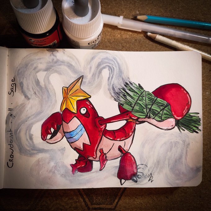 #Crawdaunt 🌿 #Sage #Inktober / #Witchtember day 11 : Un petit #Colhomard qui fait un rituel de purification avec de la sauge blanche. Il a eu de la chance, ma première idée était de le mettre dans une marmite à cuire avec de la sauge ! #art #artwork #pokemon #fanart