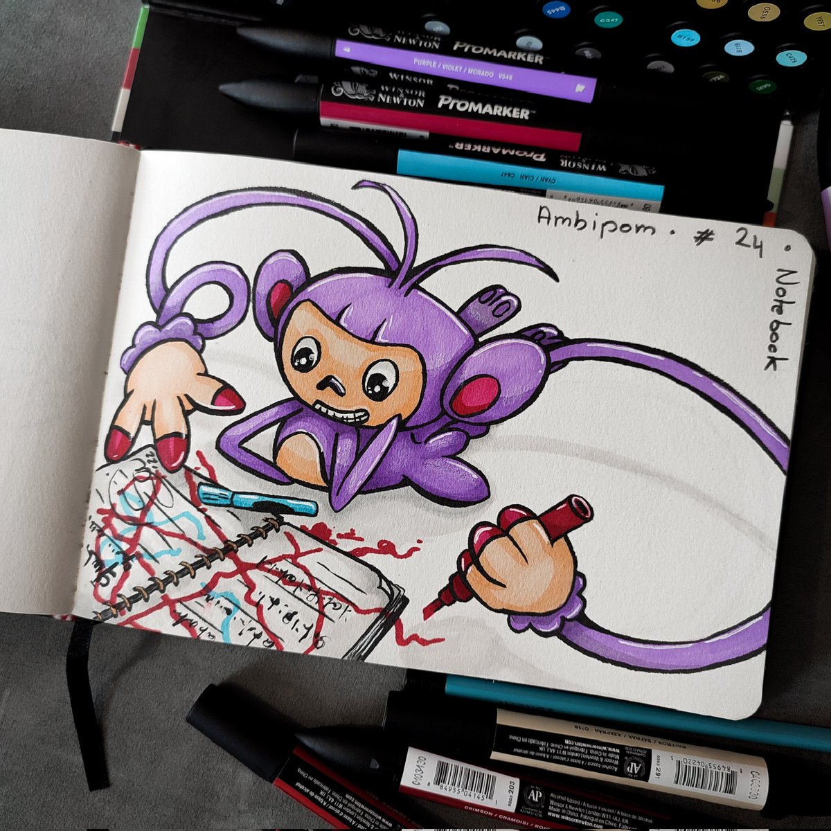 #Ambipom 📒 #Notebook #Inktober / #Witchtember day 24 : #Capidextre qui fait des bêtises et prend le carnet de notes pour un livre de coloriage ! Oups... #art #artwork #fanart #Pokemon #pokemonart #pokemonfanart #pokemonfan #markers #alcoholmarkers #promarker