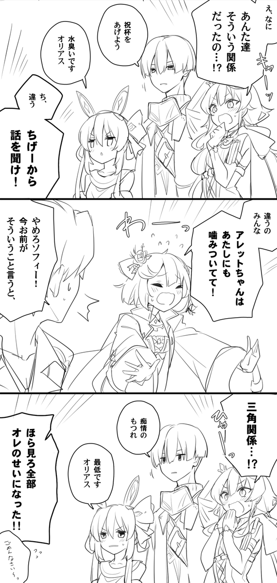 66 220 なんか色々あってオーレル君としっしょが見せかけの結婚式することになったんだけど偽装だとうまく伝わってなかったルルアちゃんが私情を含んだフィクスさんに手伝ってもらって式に乗り込んだ時の一部始終です(描きたいとこだけ描いたシリーズ) 23/02/26 23:11