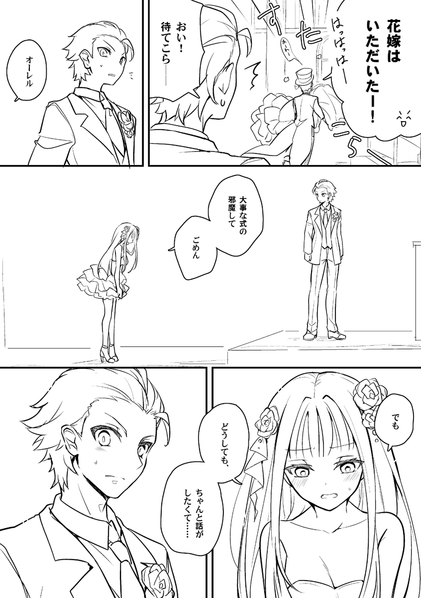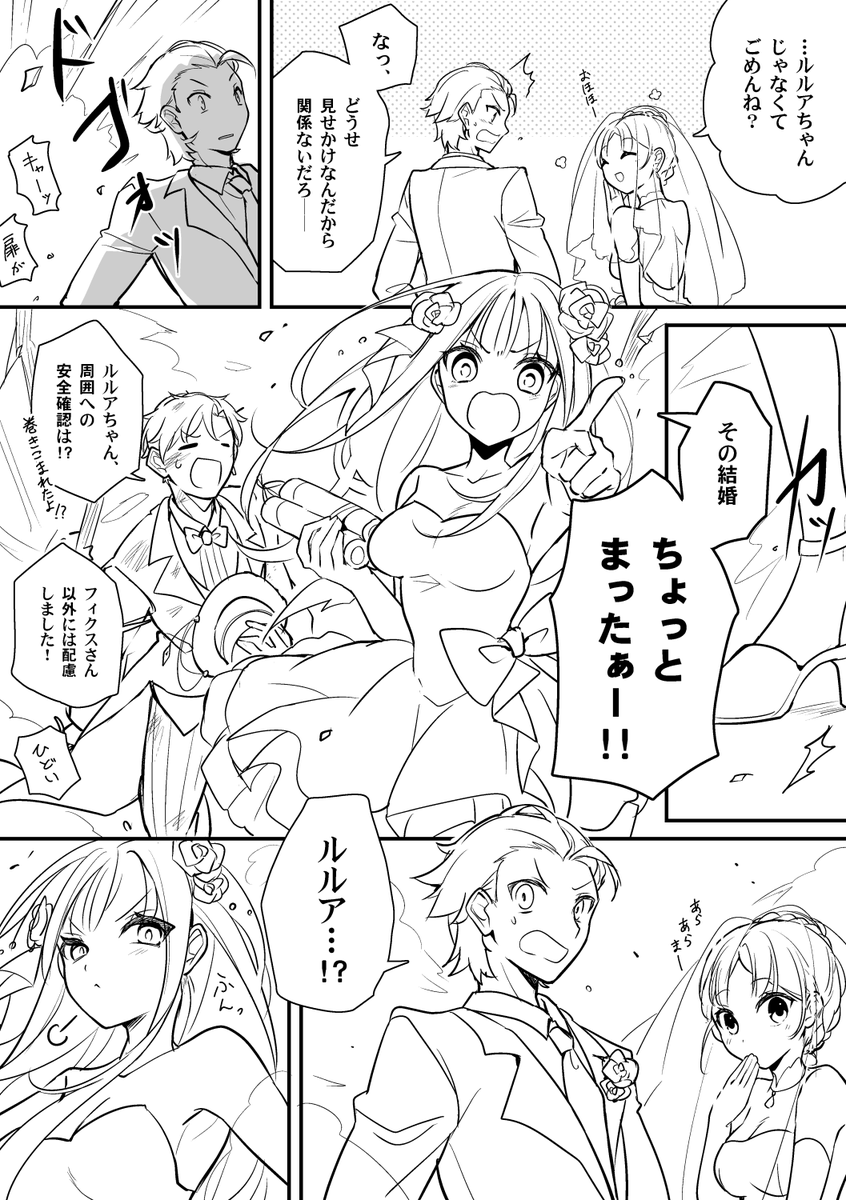 なんか色々あってオーレル君としっしょが見せかけの結婚式することになったんだけど偽装だとうまく伝わってなかったルルアちゃんが私情を含んだフィクスさんに手伝ってもらって式に乗り込んだ時の一部始終です(描きたいとこだけ描いたシリーズ)