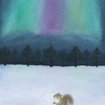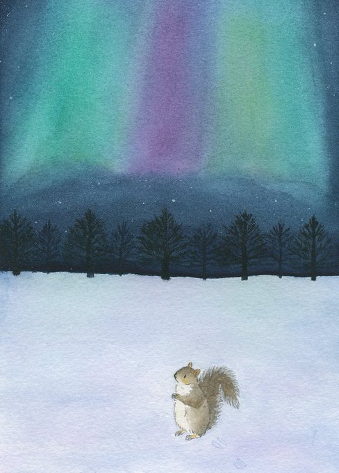 What is there, under the curtain of light? #Watercolor #watercolorpainting #squirrel #aurora #透明水彩 #水彩画 #リス #オーロラ