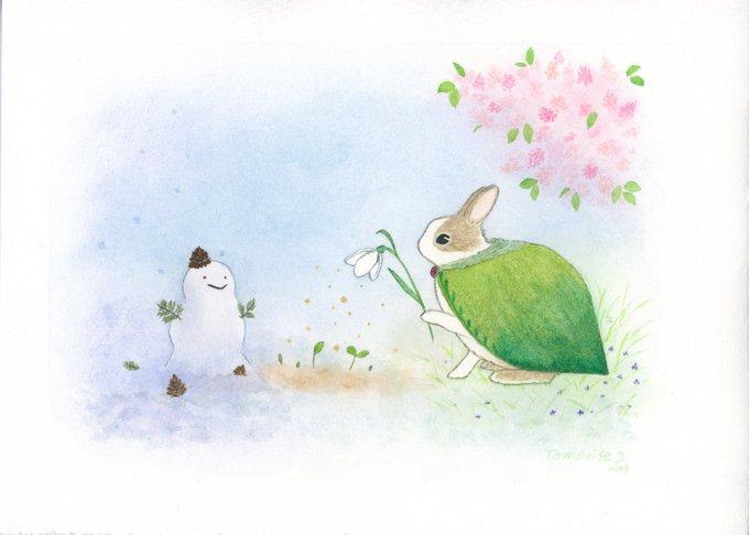 <From winter to spring> Thank you snowman! You protected this place well during this winter. 冬から春へ 雪だるまさんへ感謝と労いを。 #watercolor #watercolorpainting #rabbit #bunny #透明水彩 #水彩画 #うさぎ #うさぎ好きさんと繋がりたい