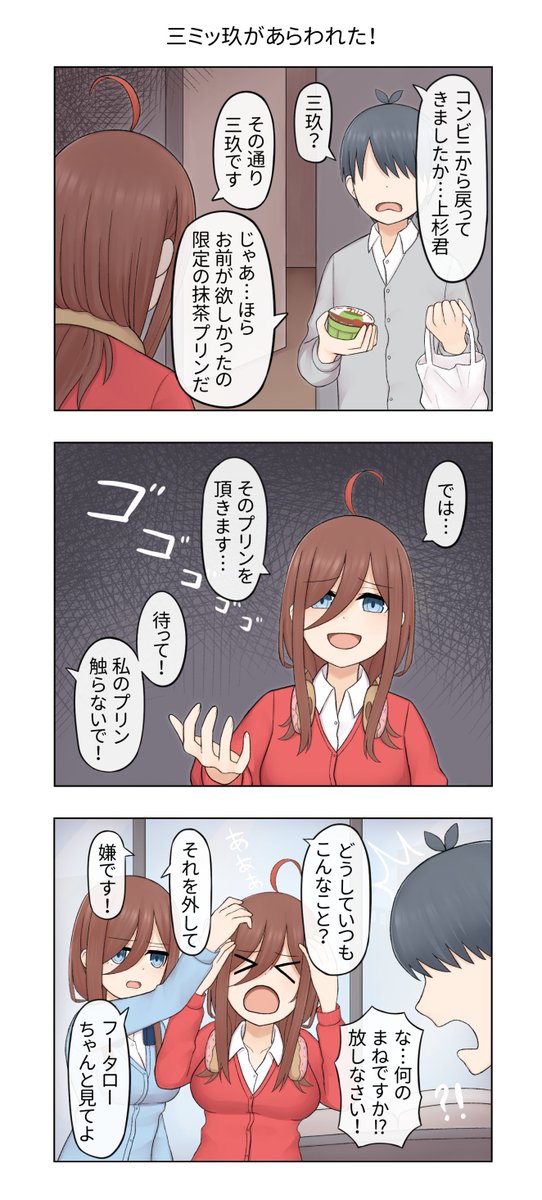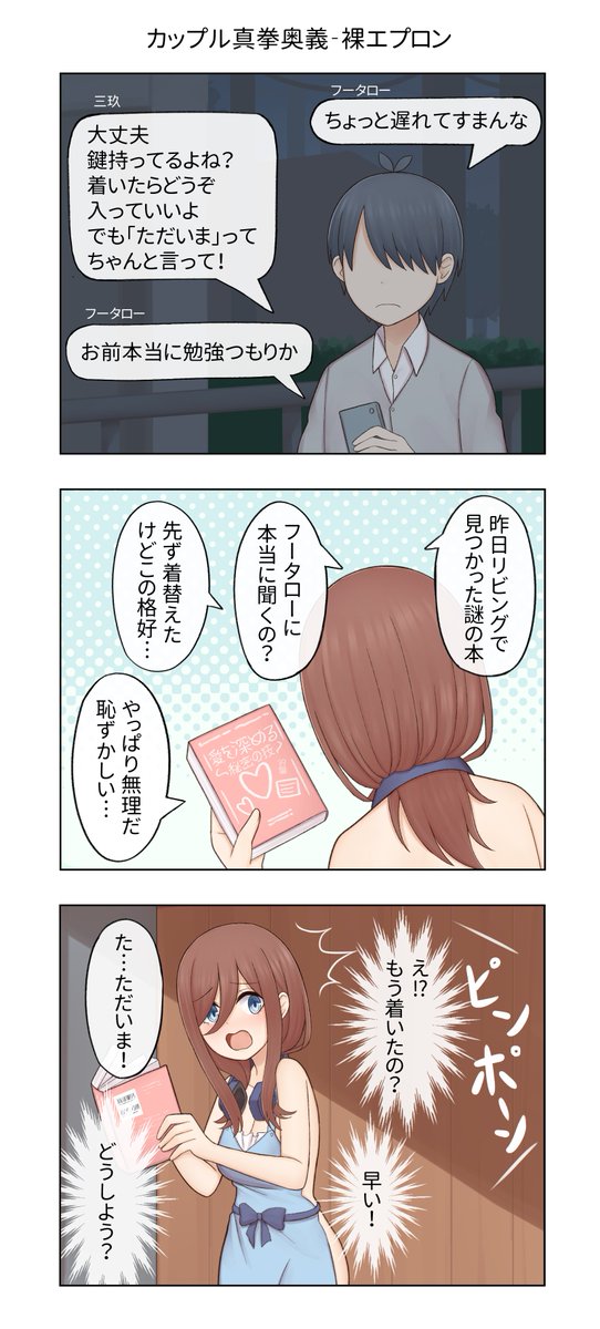 (2/2)ちょっとわがままな三玖ちゃん⑱ 「お...お帰り、あの、そうだ、ご飯にする?お...お風呂にする?それとも...」 #五等分の花嫁 #中野三玖