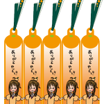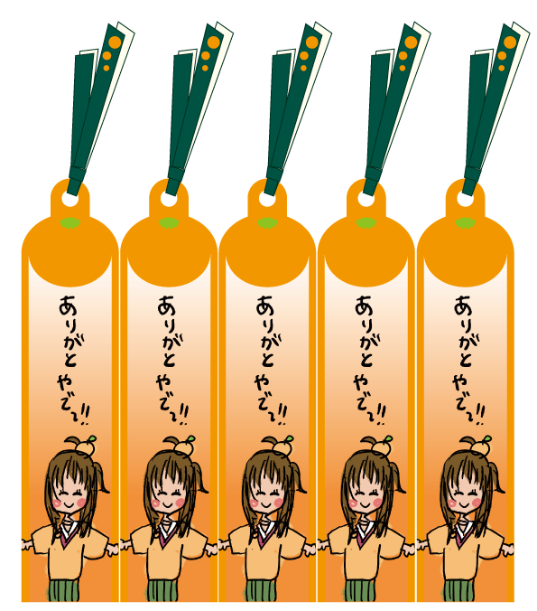 @mikannovocal こんな感じのしおりも、良いかもしれない。 紐(ひも)はみかん先生の帯をイメージ。 しおりの上部にみかん。 中央にセリフ。下部にイラスト。 着物の柄のしおりにしたパターンも良き。 #スナックみかん #みかんとボーカルノート #みかんあ〜とのーと #こら隊