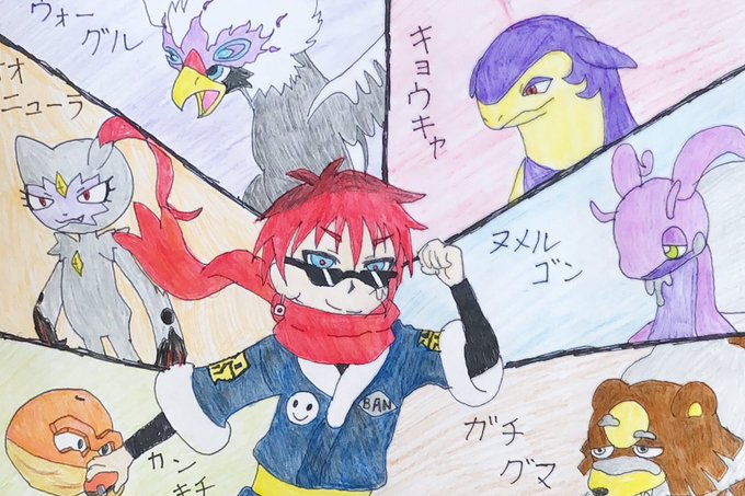 9 42 司さん描けた〜 カンキチがマルマインじゃないのは進化する前に描いてしまったので許して・・・ #天絵画 22/02/12 08:10