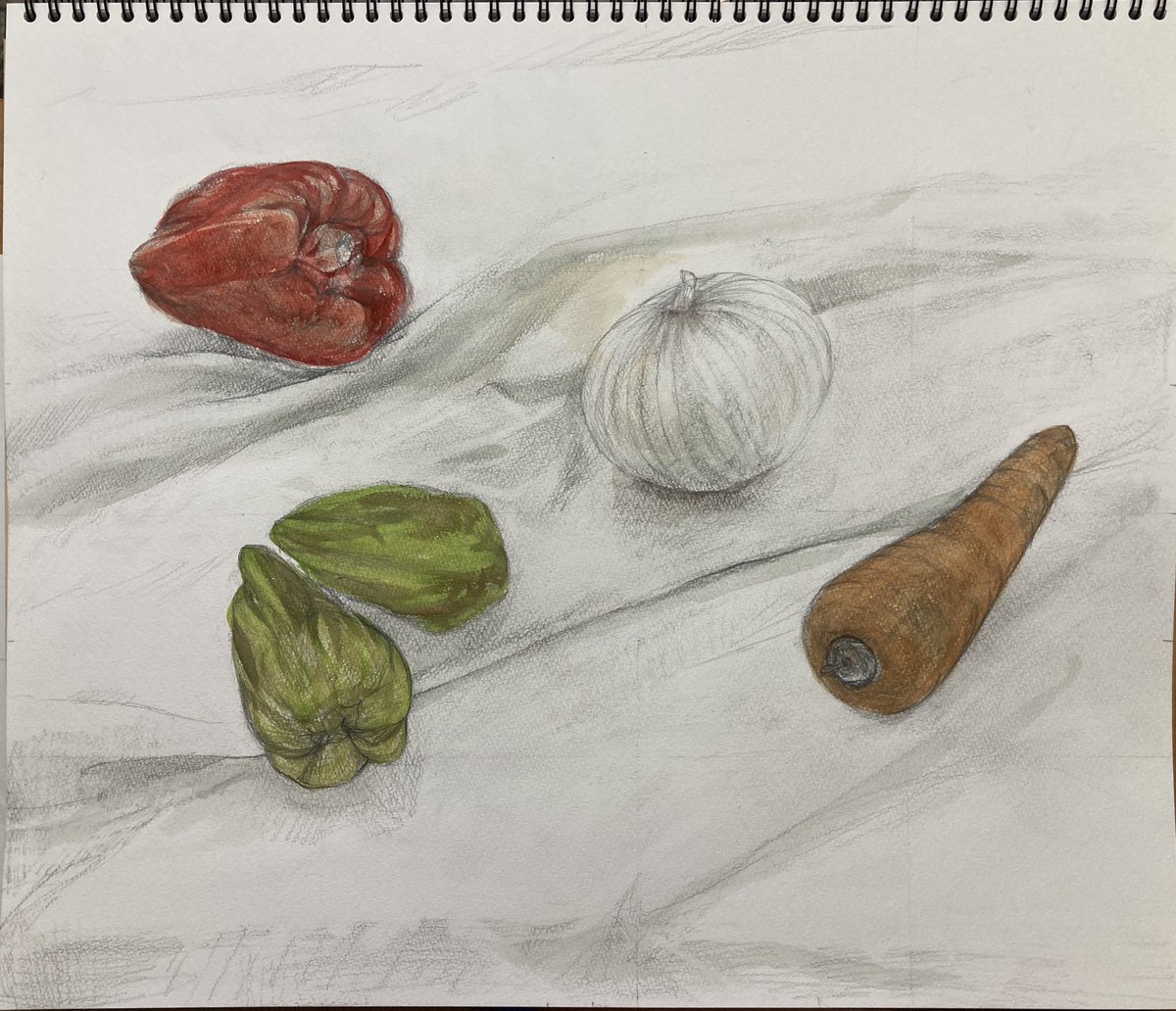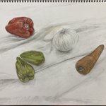 6 70 #静物 #デッサン #水彩画 静物画。新玉葱、人参、ピーマン、パプリカ。段々難しくなる。時間かかったけど基本課題なので頑張る。塗り分けや白の使い方大変勉強になりました。😂 23/05/06 20:36