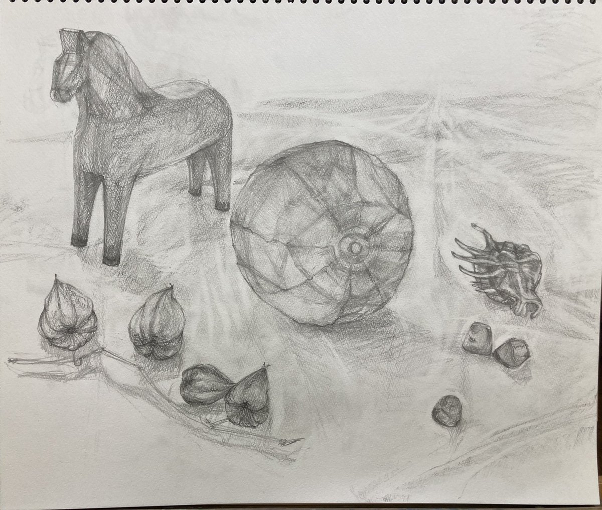 #日々描く #デッサン #静物画 #水彩画 紙風船と木彫りの馬、鬼灯、貝殻、ガラスの置物。なんとか完成。本日も余裕なくギリギリ。モチーフに気に入ったもの選んだけど構成に悩んで時間がかかった。課題だな…。
