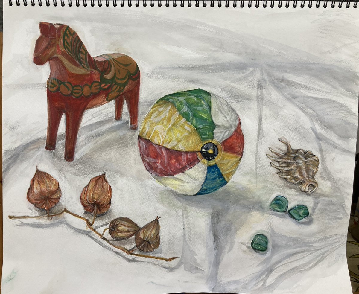 10 102 #日々描く #デッサン #静物画 #水彩画 紙風船と木彫りの馬、鬼灯、貝殻、ガラスの置物。なんとか完成。本日も余裕なくギリギリ。モチーフに気に入ったもの選んだけど構成に悩んで時間がかかった。課題だな…。 23/05/27 21:15