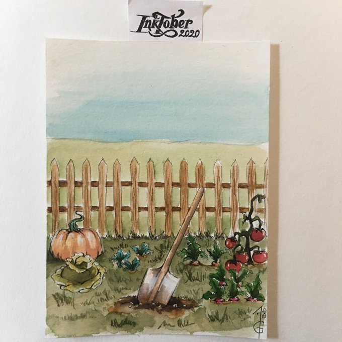 #Inktober Day 24 : dig Inspired by our modest vegetable garden ... may it survive to the cats and rabbit ...🐱🐰🤞🏻 Made with @CopicEurope liners, @Pebeopaints colorex on @Hahnemuehle watercolor paper. #inktober2020 #dig #vegetablegarden #artist #artwork #drawing #illustration