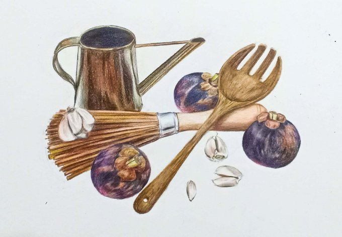 Aaaaaand another one (still life assignment) Coloured pencils on paper (A3) #artidn #ArtistOnTwitter #zonakaryaid #traditionalart