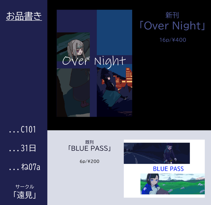 あなたのサークル「遠見」は、コミックマーケット101で「土曜日西地区 "ね " 07a」に配置されました!コミケWebカタログにてサークル情報ページ公開中です! webcatalog.circle.ms/Circle/1681889… #C101WebCatalog 新刊は女の子が酒飲みながら夜歩く感じのイラスト本になると思います、頑張ります🍶