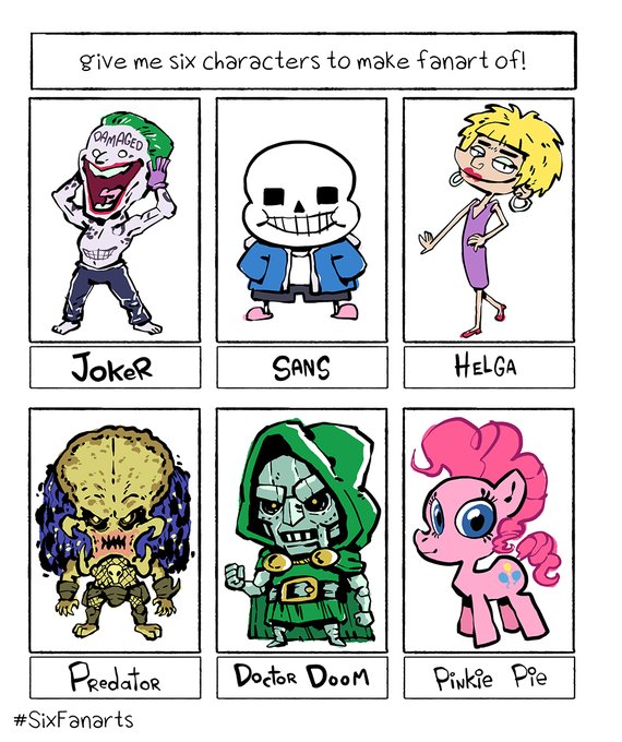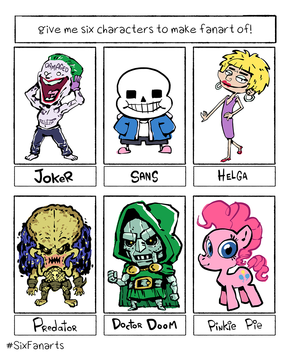 Here are my #SixFanarts Joker, Sans, Helga, Predator, Doctor Doom & Pinkie Pie. Thanks to @mcapriglioneart for the fun prompt.