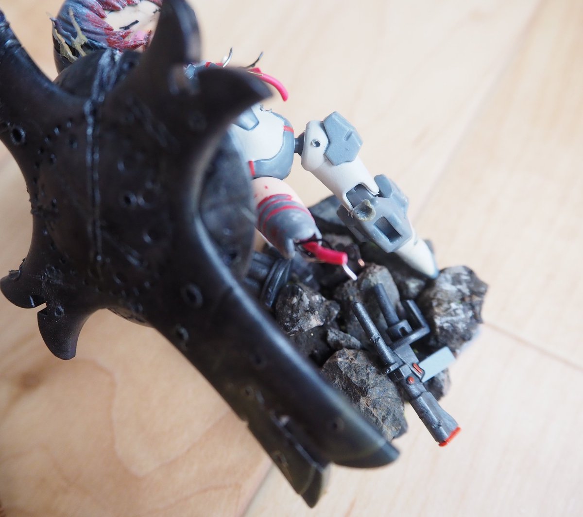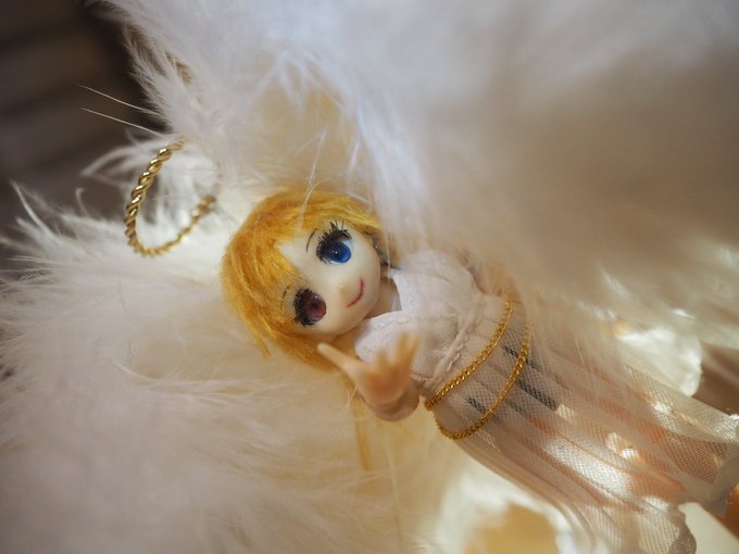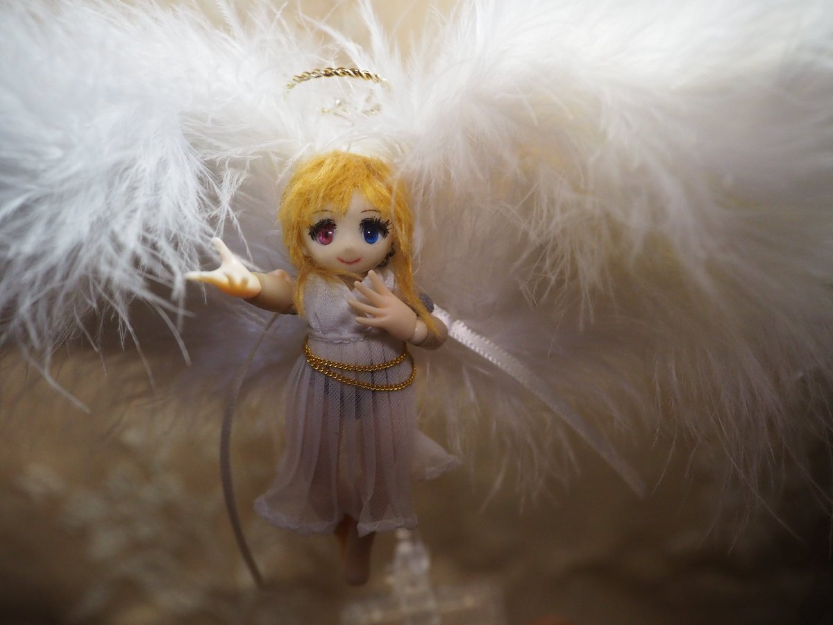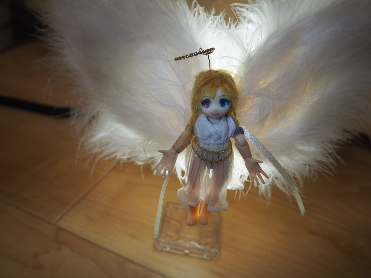 【コンテスト参加】【応募条件に同意します】【歌姫】 #デスクトップアーミー #メガミデバイス 天使 彩 天使のコスプレをした彩ちゃん。 ポージングや撮ってもらう角度によって、堕天使のようになってしまうのが難しかったと。 ワイヤーを仕込んで、羽を丁寧に縫い付けた綾子おばさんのこだわりが光る