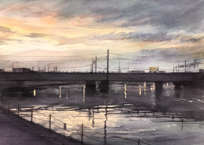 鶴見川、夕景。 #透明水彩 #透明水彩研究会 #watercolor