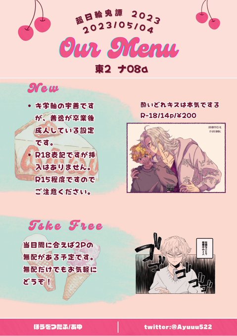スペース出てました❣️ 5/4 もうぜんぶ、8 ▷▶東2 ナ08a です、よろしくお願いします🌸 本文10P程度の宇善を頒布しようと思ってます。 間に合いますように🙇 twitter.com/ayuuu522/statu…