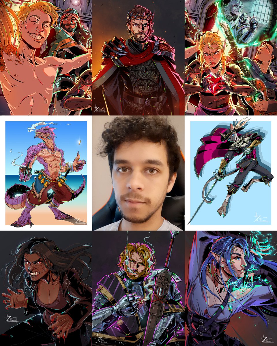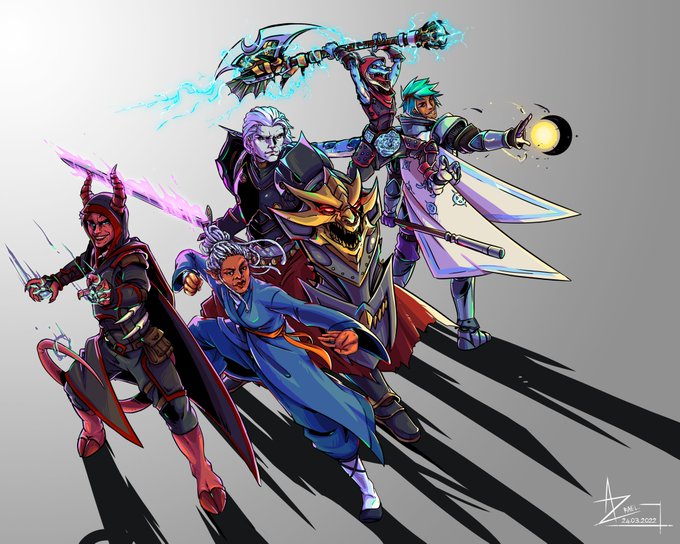 #ArtAdventCalendar Day 11 This party commission I did a while back had some fun characters to draw: a tiefling warlock, elf monk , aasimar paladin , kobold barbarian and shifter cleric #HumanArtists #ttrpg #DnD #dndart