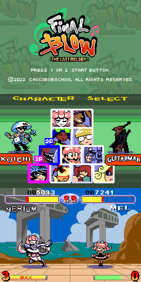 Final Blow The Last Melody! A Fighting Game Based in Music. @KosenaMaster Maracas, @nekocrocodile Xylophone, Issy Shamisen, @Lemenge1 Bagpipe, @AzuPsx Harp, AXXL Fiddle, @odiresan Piano, @Sepo_Morales Drum, @cottonkaddy Guitar, @RoyalityKnight E. Guitar #fightinggame#pixelart