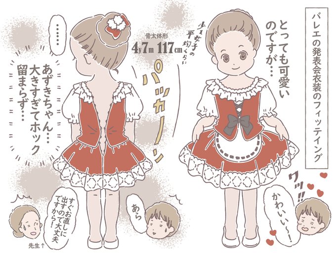 バレエ発表会の衣装フィッテイングでの事。 大き目&骨太体形のあずきちゃんです😓 みんな華奢なのね…💦 #4歳児 #育児絵日記 #育児漫画 #エッセイ漫画 #子育てあるある #子育て漫画
