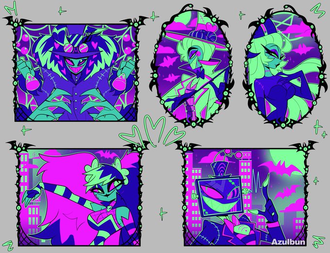 I forgot to post this but here's some of my work for the HellaFanClndr. And bonus concept art that didn't make it but still looks cool! #HazbinHotel #HazbinHotelAlastor #velvet #Vox #Valentino
