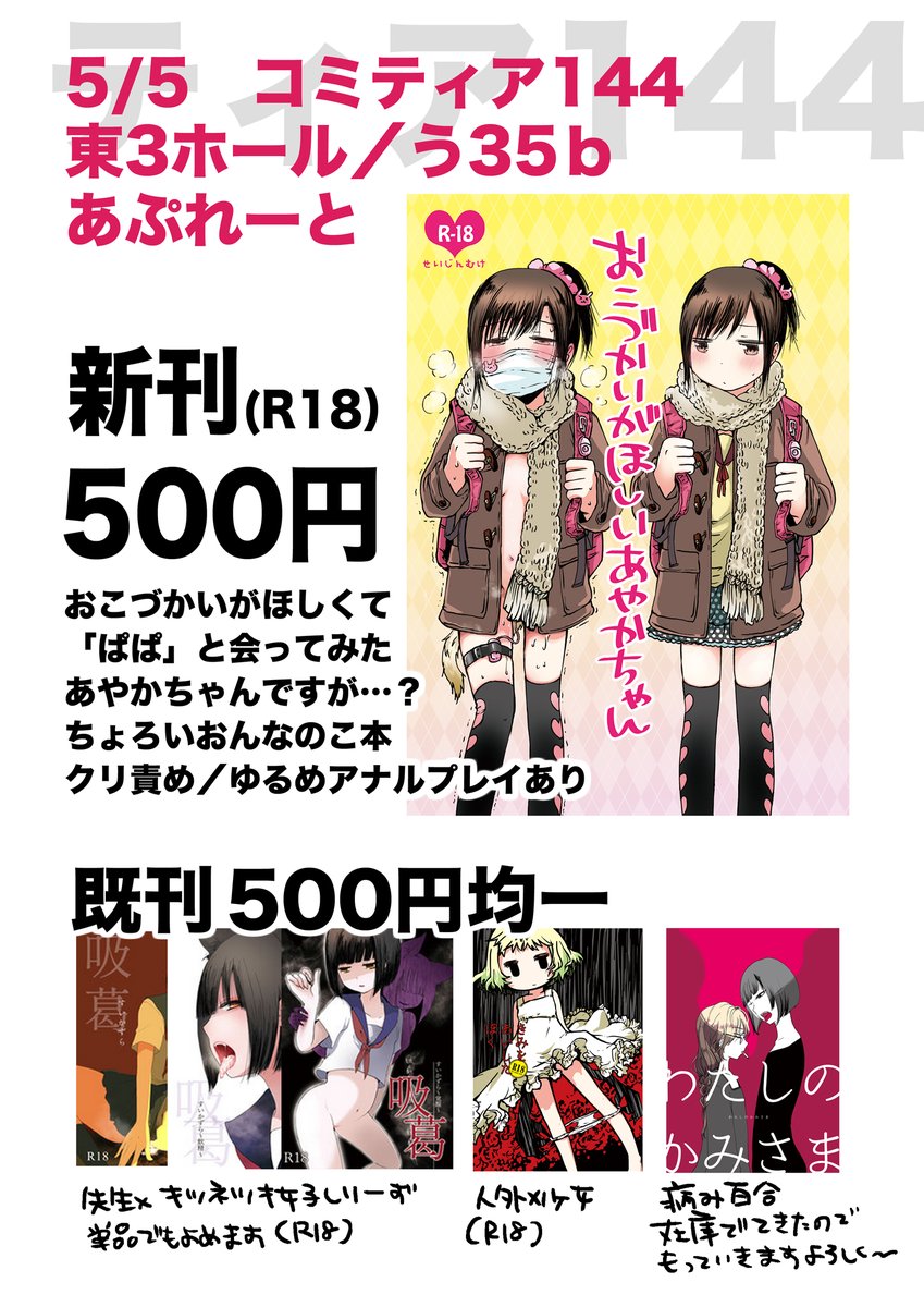 コミティア144のおしながきできたよ! _人人人人人人人人人人人_ > 今回もトイレが近い <  ̄Y^Y^Y^Y^Y^Y^Y^Y^Y^ ̄ 病み堕ち百合本(全年齢向け)も少量持っていきます う35b/あぷれーとにきてね~! #COMITIA144