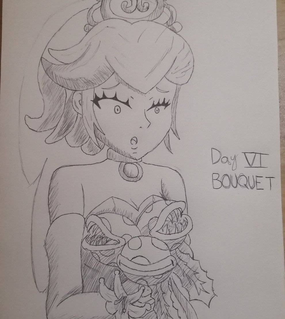 Día 6: Bouquet Las princesa Peach con un vestido de novia, sosteniendo un ramo de plantas piraña. #inktober2022 #inktober
